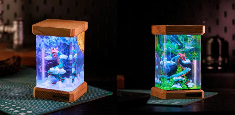 Each lamp encapsulates a miniature world where a dragon gracefully coils among mountains and clouds, illuminated by enchanting LED light. Every scale, curve, and expression is meticulously hand-crafted to capture a lifelike presence.